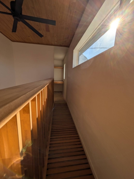 ▲木格子の廊下と手すりで風と光を通します。お布団や洗濯物を干せます!