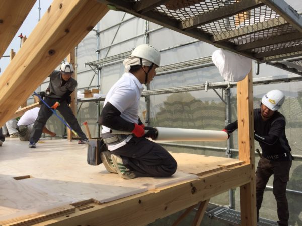 普段から一緒に家づくりに励む、多くの地元の職人たちが集まり作業が行われます。