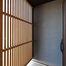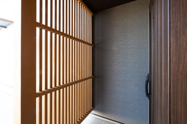 ▼玄関の目隠しの木格子が外観のアクセントに。