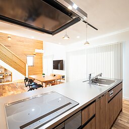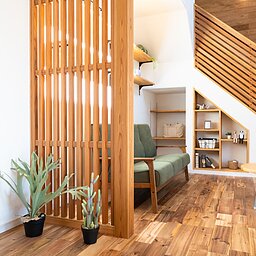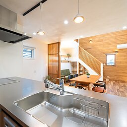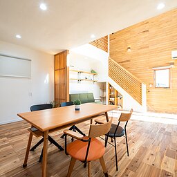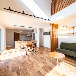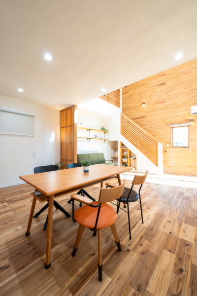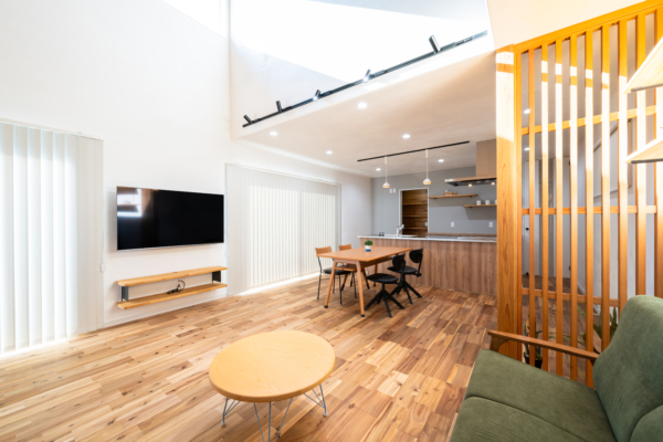 木格子を設けることで視覚的にダイニングとリビングをしきります。