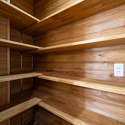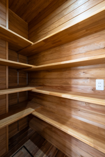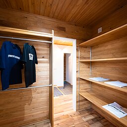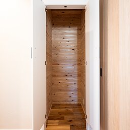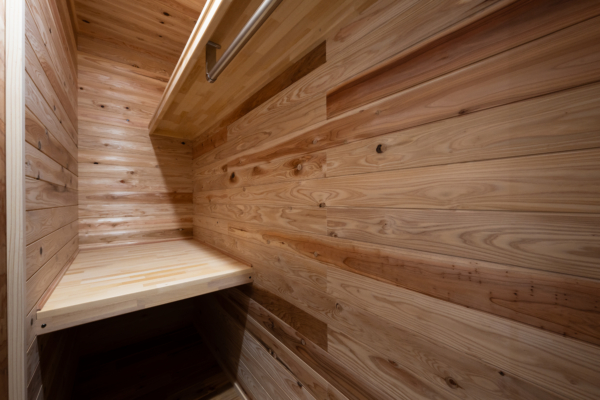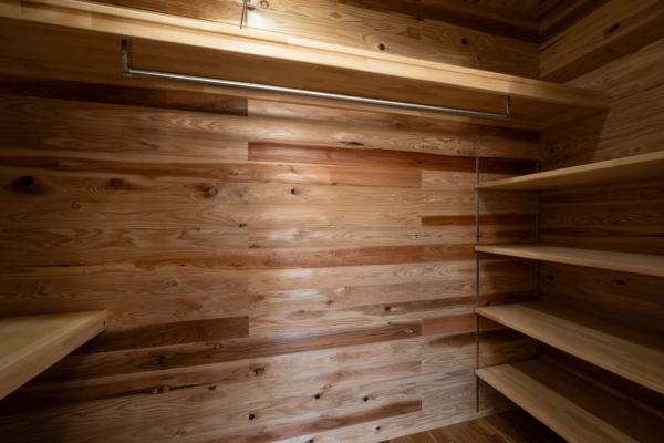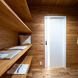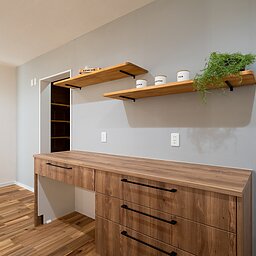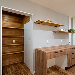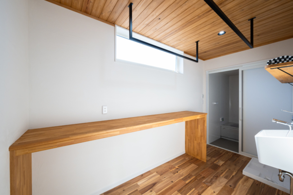 作業台にもなり、下にはぴったりサイズの収納ボックスをいれて下着やタオル類など、ここでアイロンなどもするのもよいかとおもいます!みなさんあらかじめどのくらいの収納ボックスをいれるのかを考えて棟梁と相談しながらミリ単位で造っていきます。