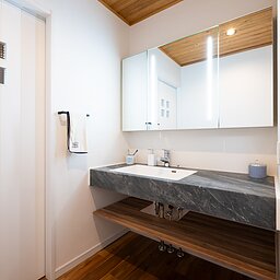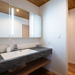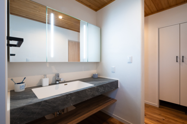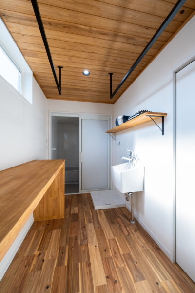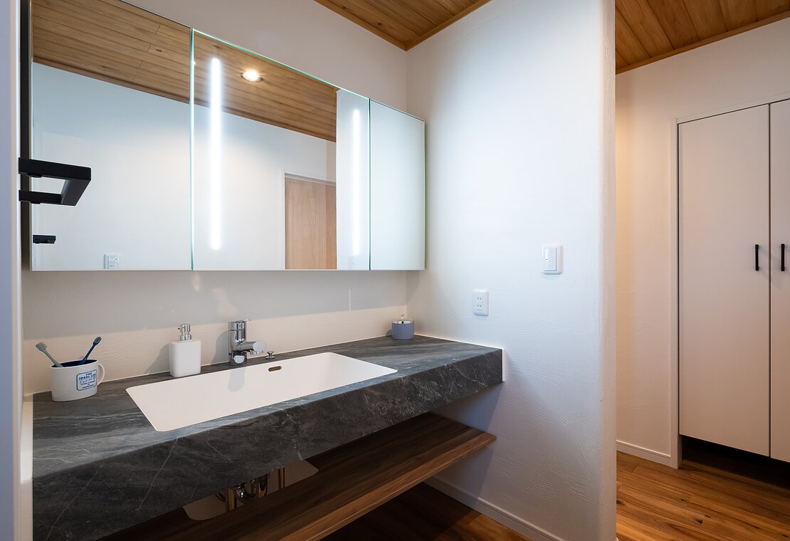 トイレ、玄関の近くに洗面を設けました。アイカの洗面で半造作です。
