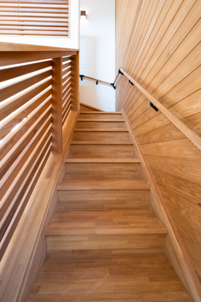 ▼階段の手すりと2階廊下の木格子手すりが段違いのようになってととても素敵。