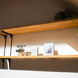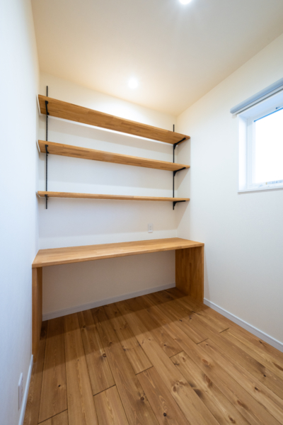 2帖の書斎を設けました。明るいけど、集中しやすいように。可動棚にして本などの高さによって変更できるように。
