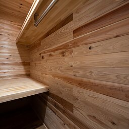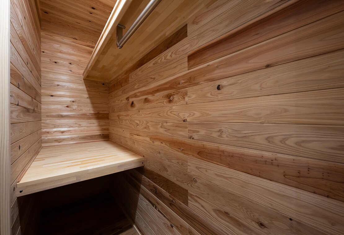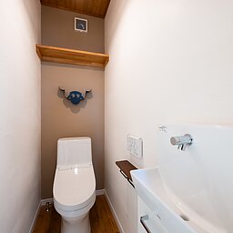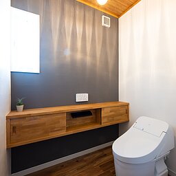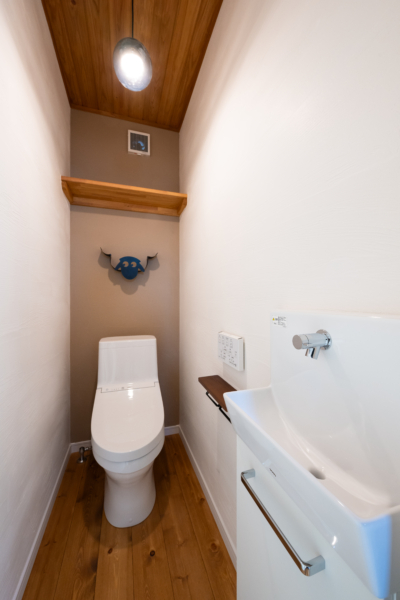 ほっと一息つくトイレも木の素材をふんだんに使って消臭、抗菌効果のある珊瑚の漆喰の塗り壁を。