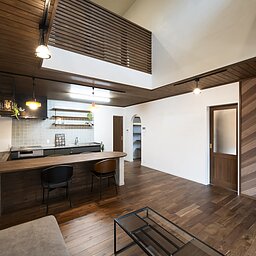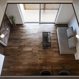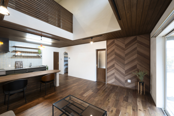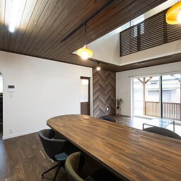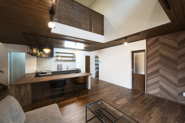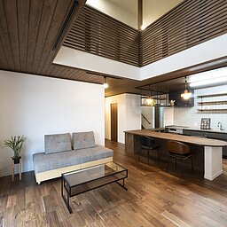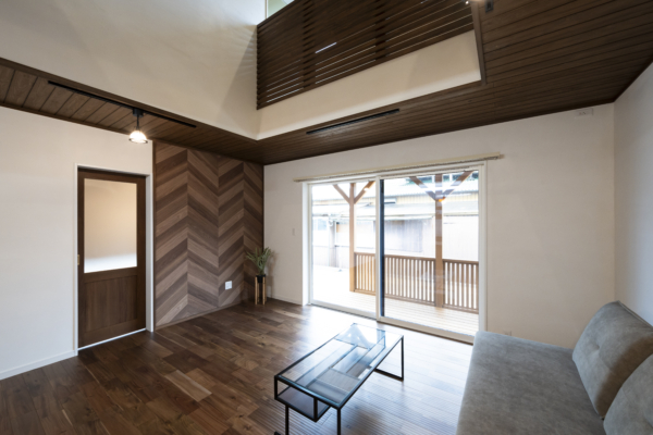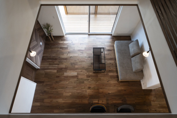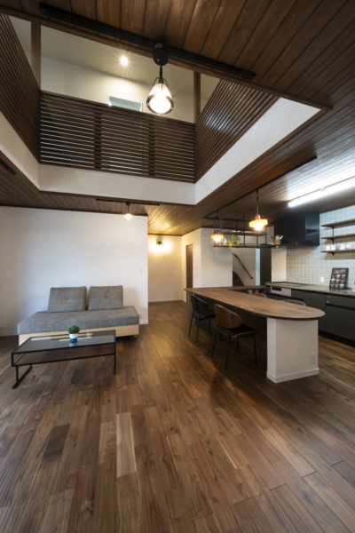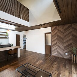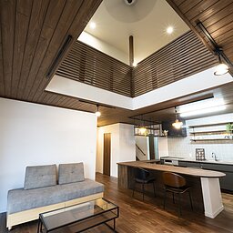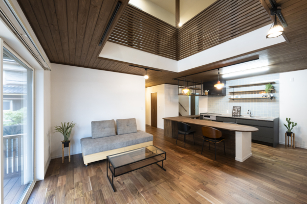 ▼リビングから見上げると木格子の吹き抜けが見えて癒しのリビングに。