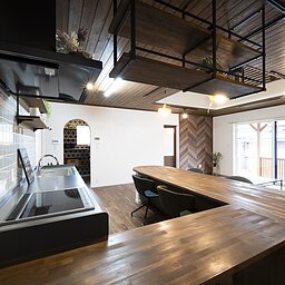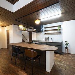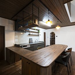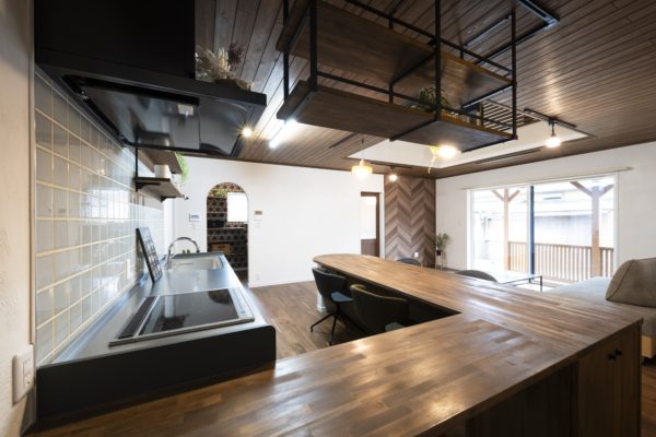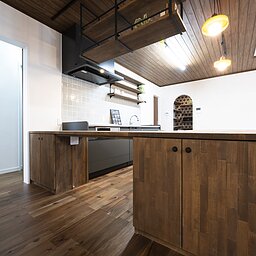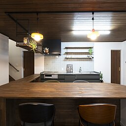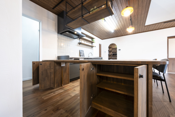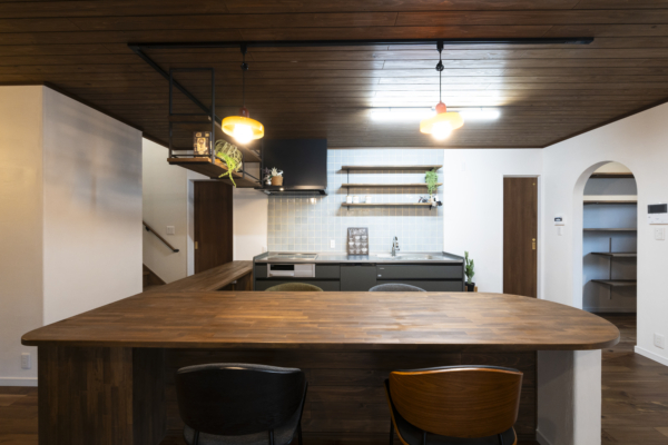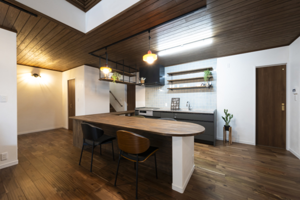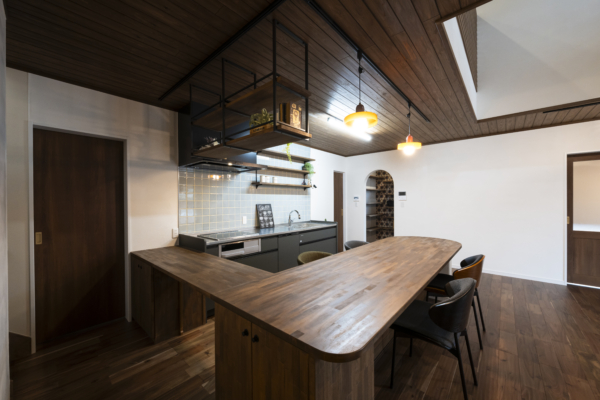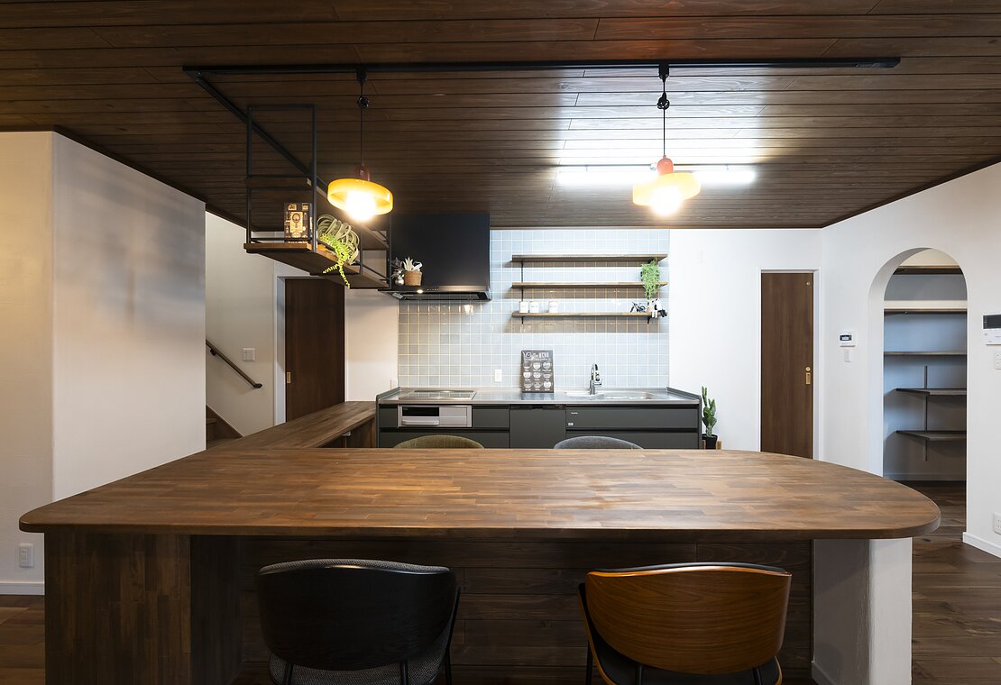 かつ、壁付けキッチンにして造作でコの字になるようカウンターにしました。