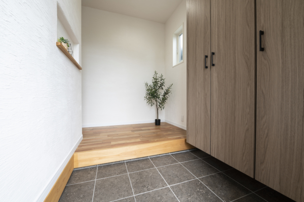 白い珊瑚の塗壁とグレージュのシューズボックスがマッチして