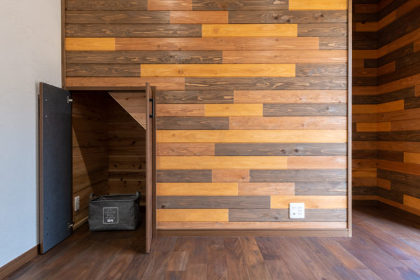 たっぷりとした階段下の物入はアクセントがある杉板を使用。