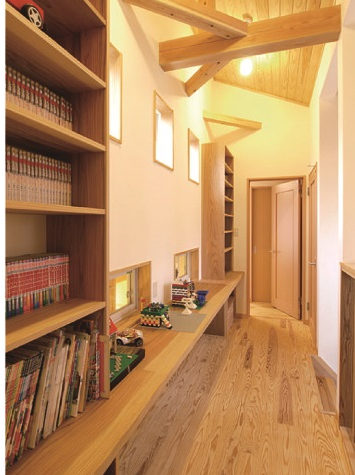 2階の廊下に大きな本棚を設置しました。家族の図書館として、親から子どもへ大切なメッセージが伝わることを願います。